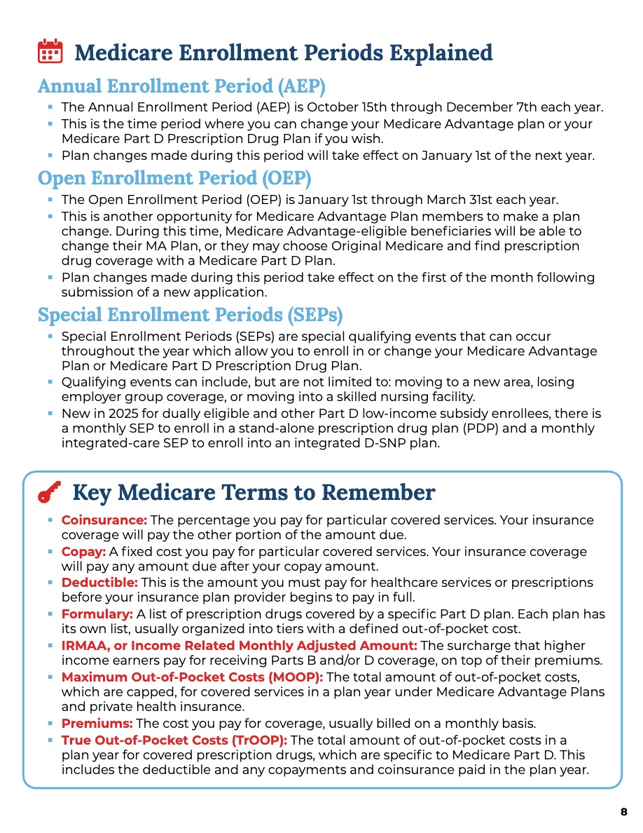 Medicare has established the period to be from Oct 15th – Dec 7th. Decisions made during this time typically go into effect Jan 1st of the next calendar year.