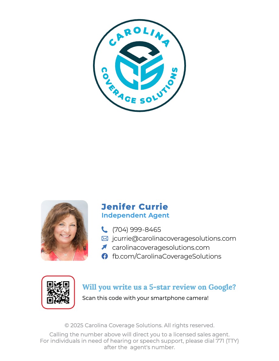My name is Jenifer Currie, and since 2012, Carolina Coverage Solutions has been just me. Prior to working as an independent insurance agent, I worked almost 10 years in Long Term Care at the Carriage Club of Charlotte. There acquired a whole new level of respect for seniors, seeing their challenges in getting older firsthand. I believe what’s most important when choosing the right plan is your budget, lifestyle, risk tolerance, flexibility, and personal history. Where carrier competition is fierce, I try to be Charlotte’s choice Medicare and Health Insurance Agent. To me, it’s more worth it to work hard to keep a client than to work to replace one. Providing my clients with marketplace affordable health care is what has kept so many of my clients happy throughout the years.